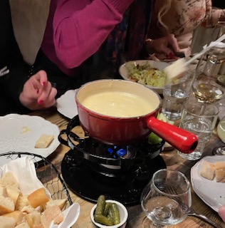 Gathering with friends, sharing a Fondue followed by a Kafi-Schnaps and dessert.